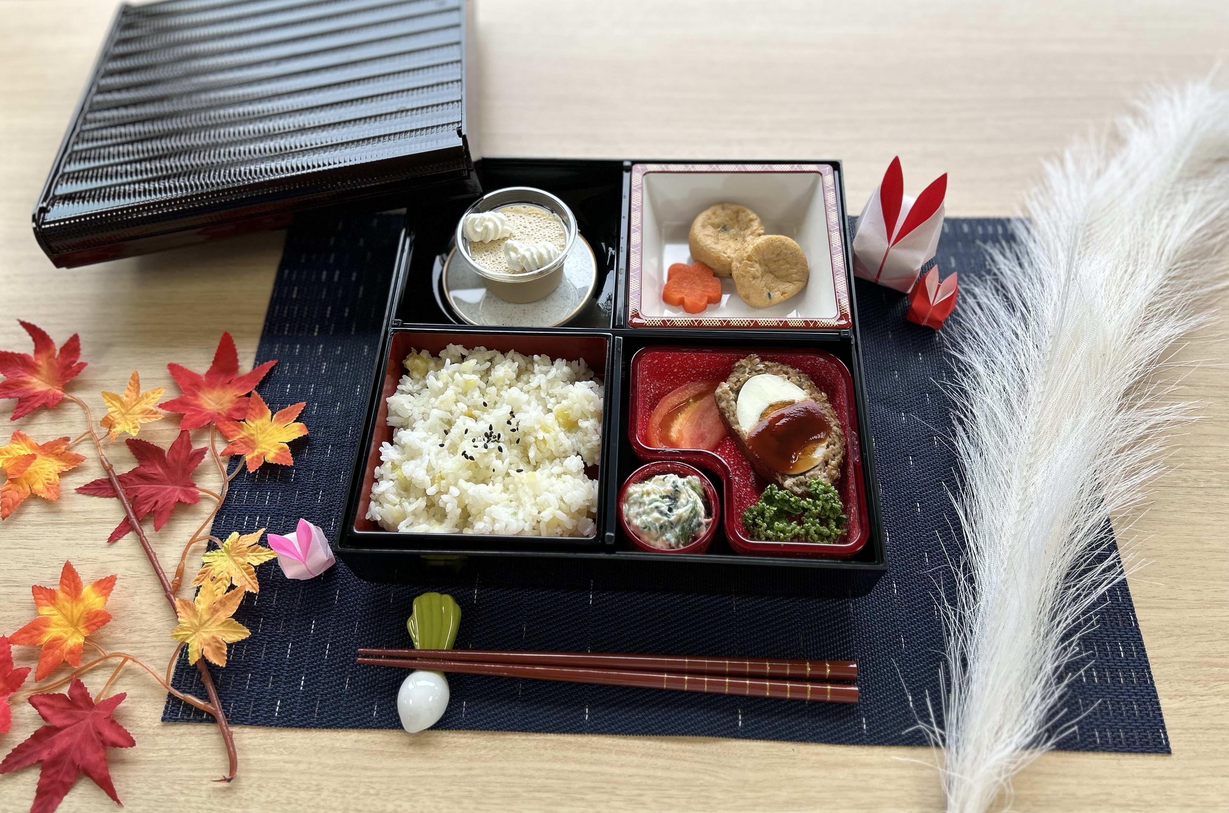 月見御膳 2024年10月04日 10月2日 昼食『月見御膳』 メニュー 芋ごはん スコッチエッグ がんも ほうれんそうの白和え すまし汁(花麩、昆布) マロンムース デザートのマロンムースは雲がかかったお月さまに見立てました
