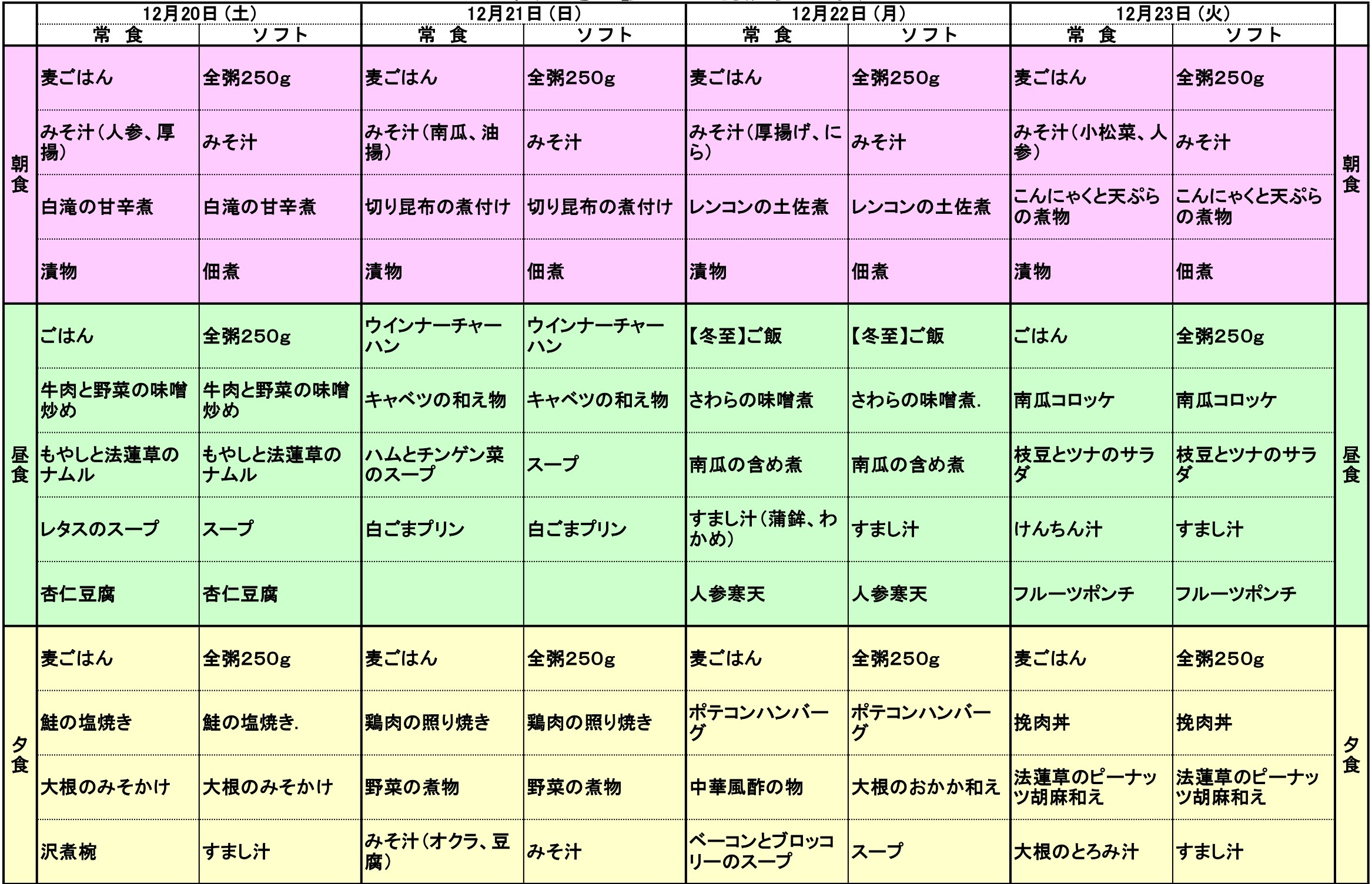12/20~12/23の献立表