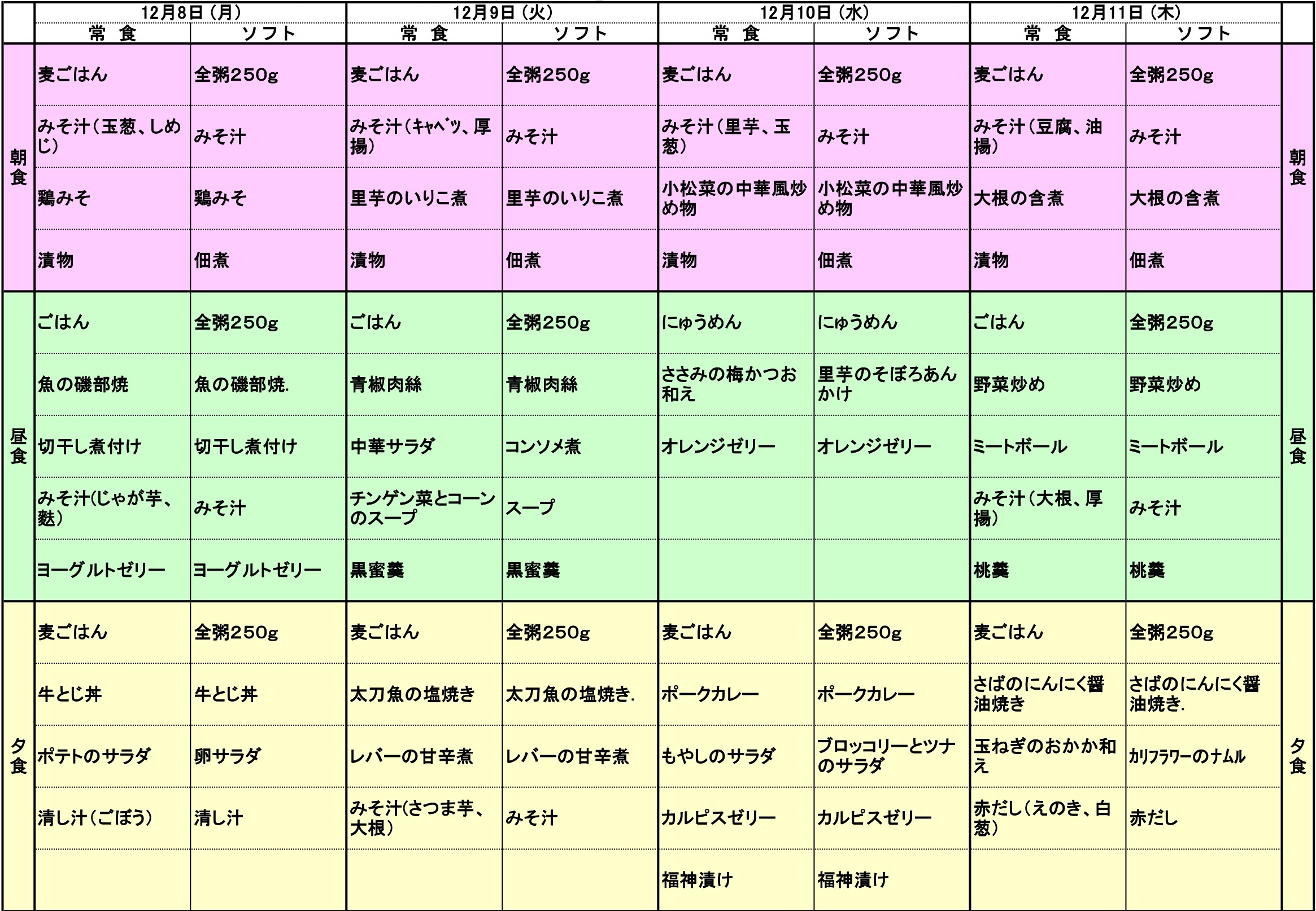 12/8~12/11の献立表