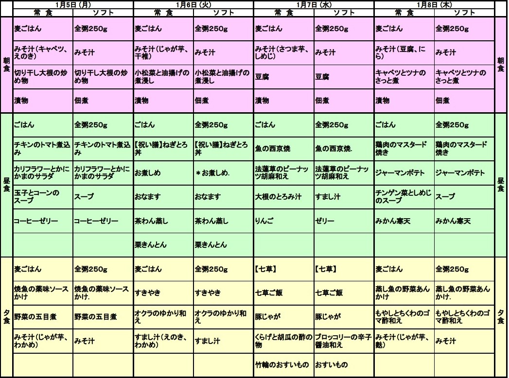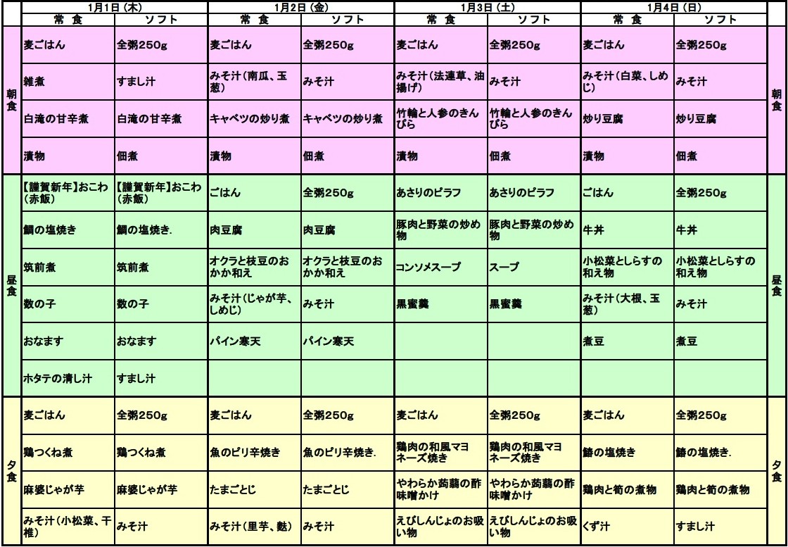 1/1~1/4の献立表