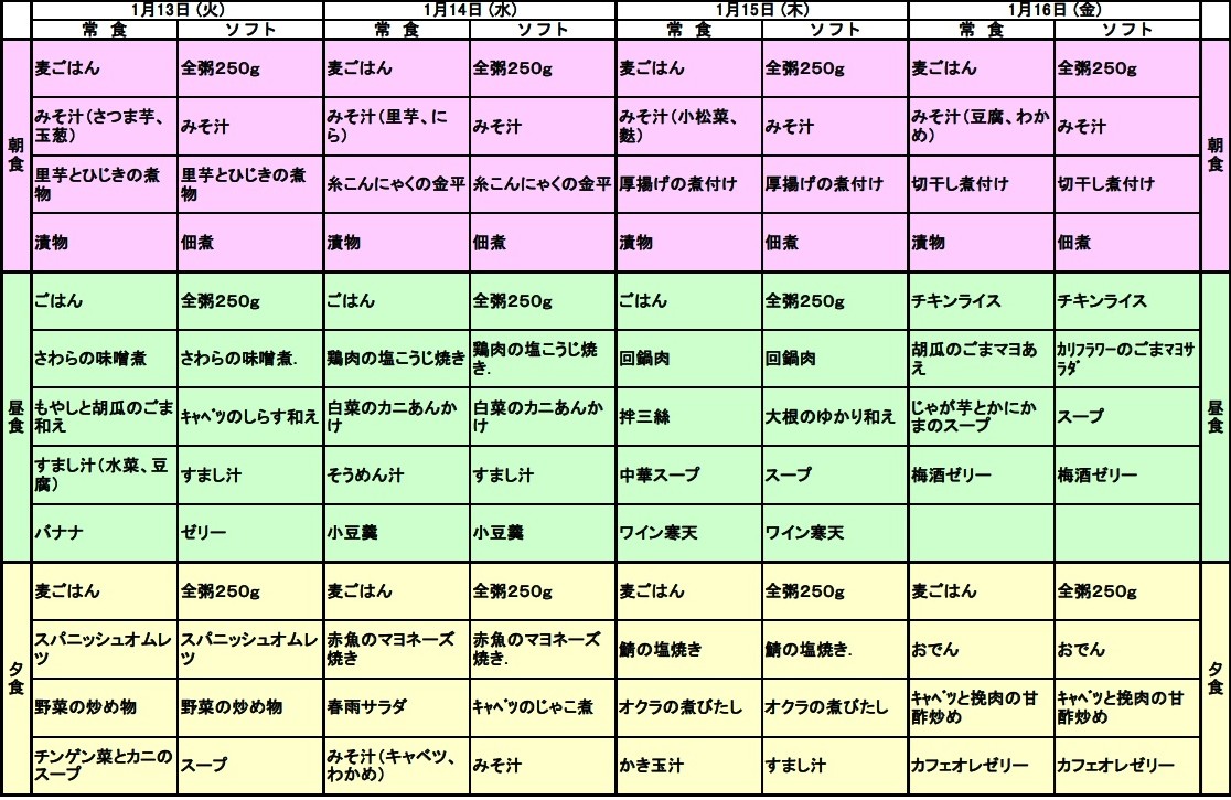 1/13~1/16の献立表
