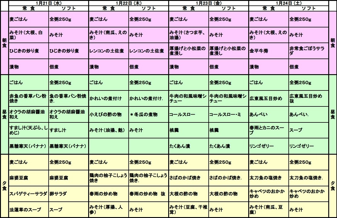 1/21~1/24の献立表