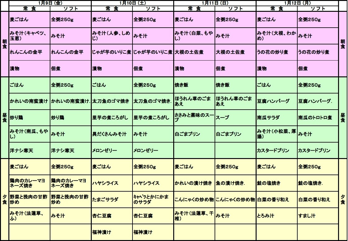1/9~1/12の献立表