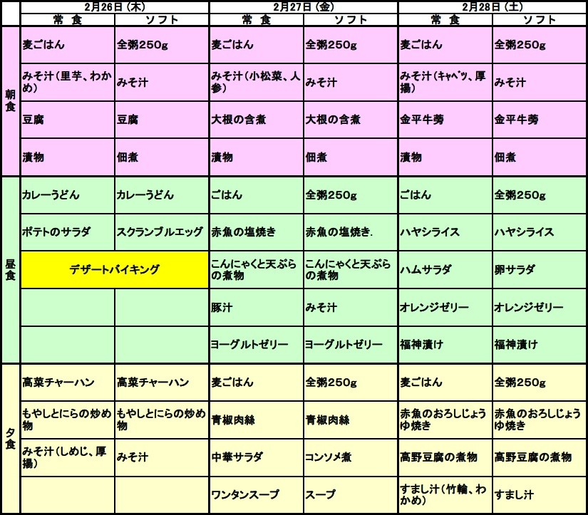 2/26~2/28の献立表