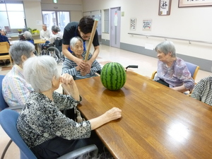 テーブルを囲んで、すいか割をしました(*^_^*)