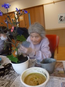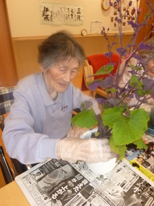ユニットに飾るお花を入居者様に植え替えしていただきました。