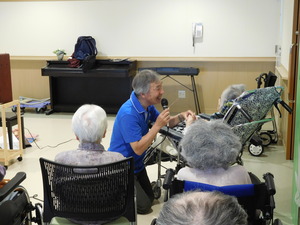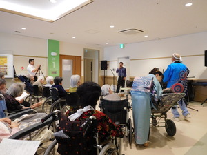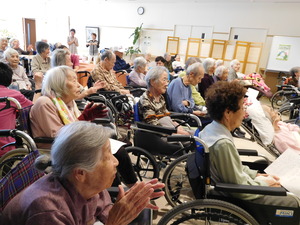 入居者様もよくご存じの歌が多く、一緒に口ずさんだり身体を動かしてリズムを取ったり・・・