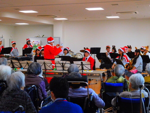 サンタに扮した生徒さん方から、吹奏楽やハンドベルの演奏のプレゼント!