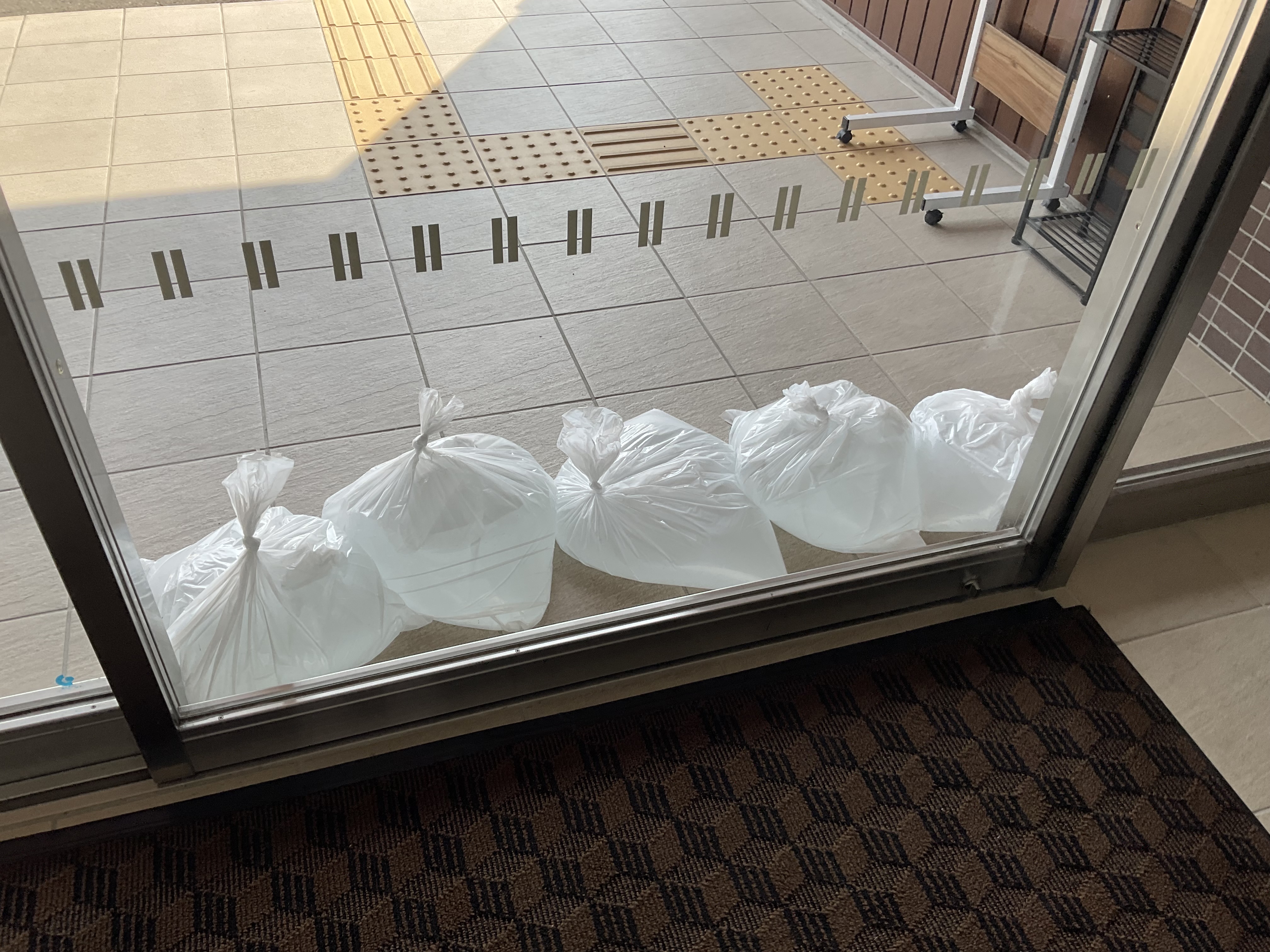 玄関や通用口は浸水被害を抑えるために水嚢(代用品で)の設置をし、