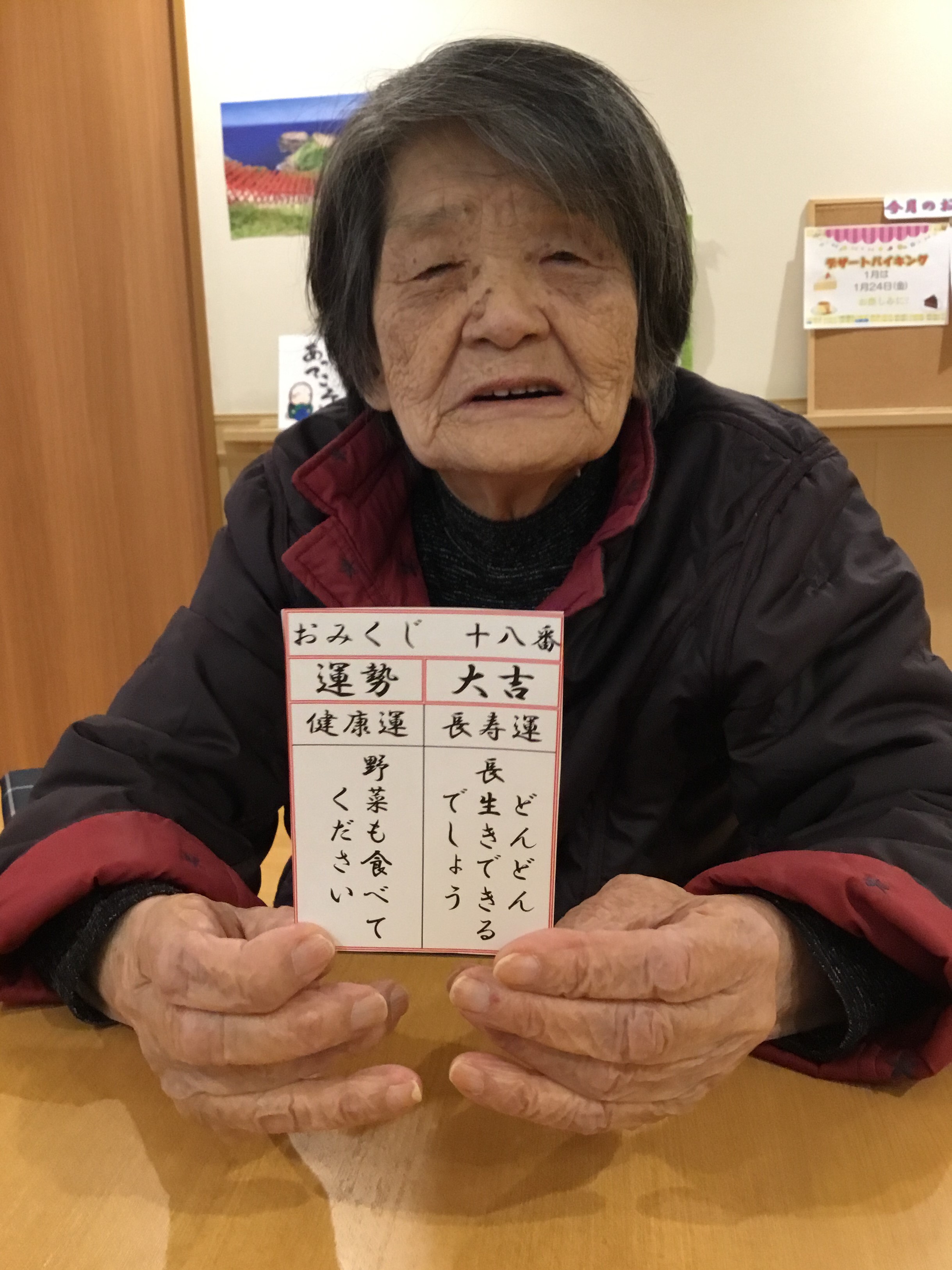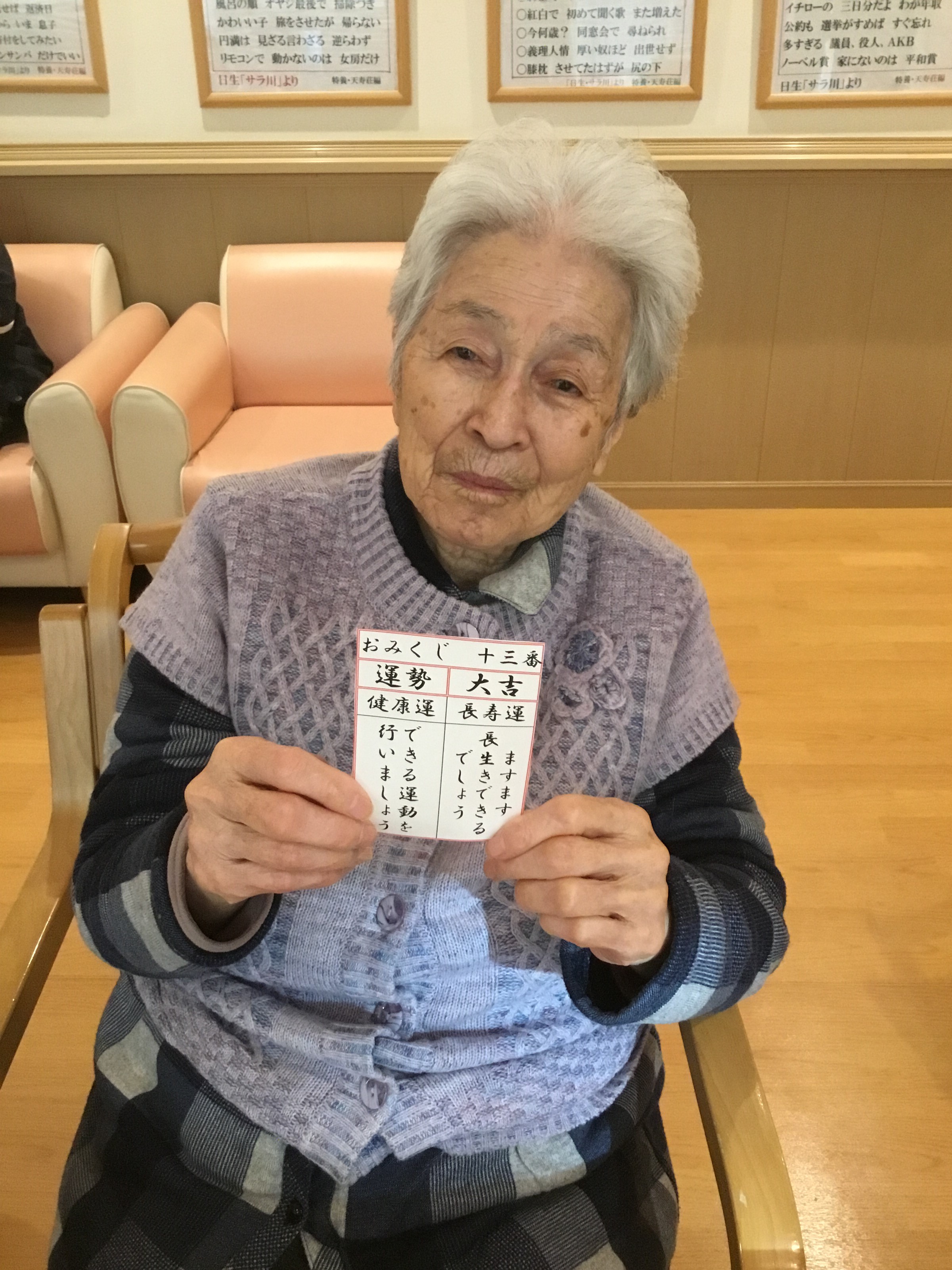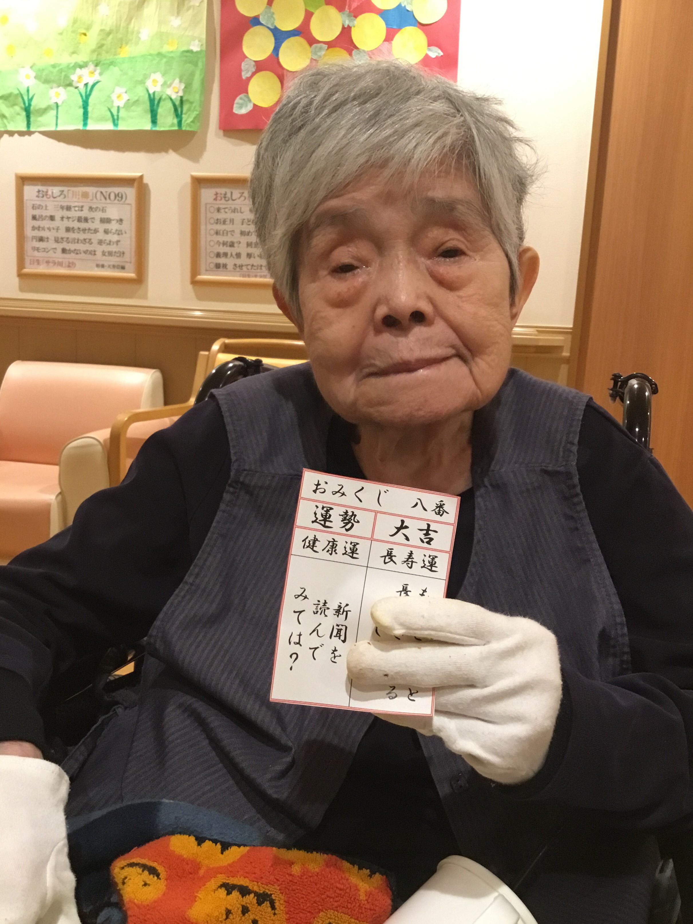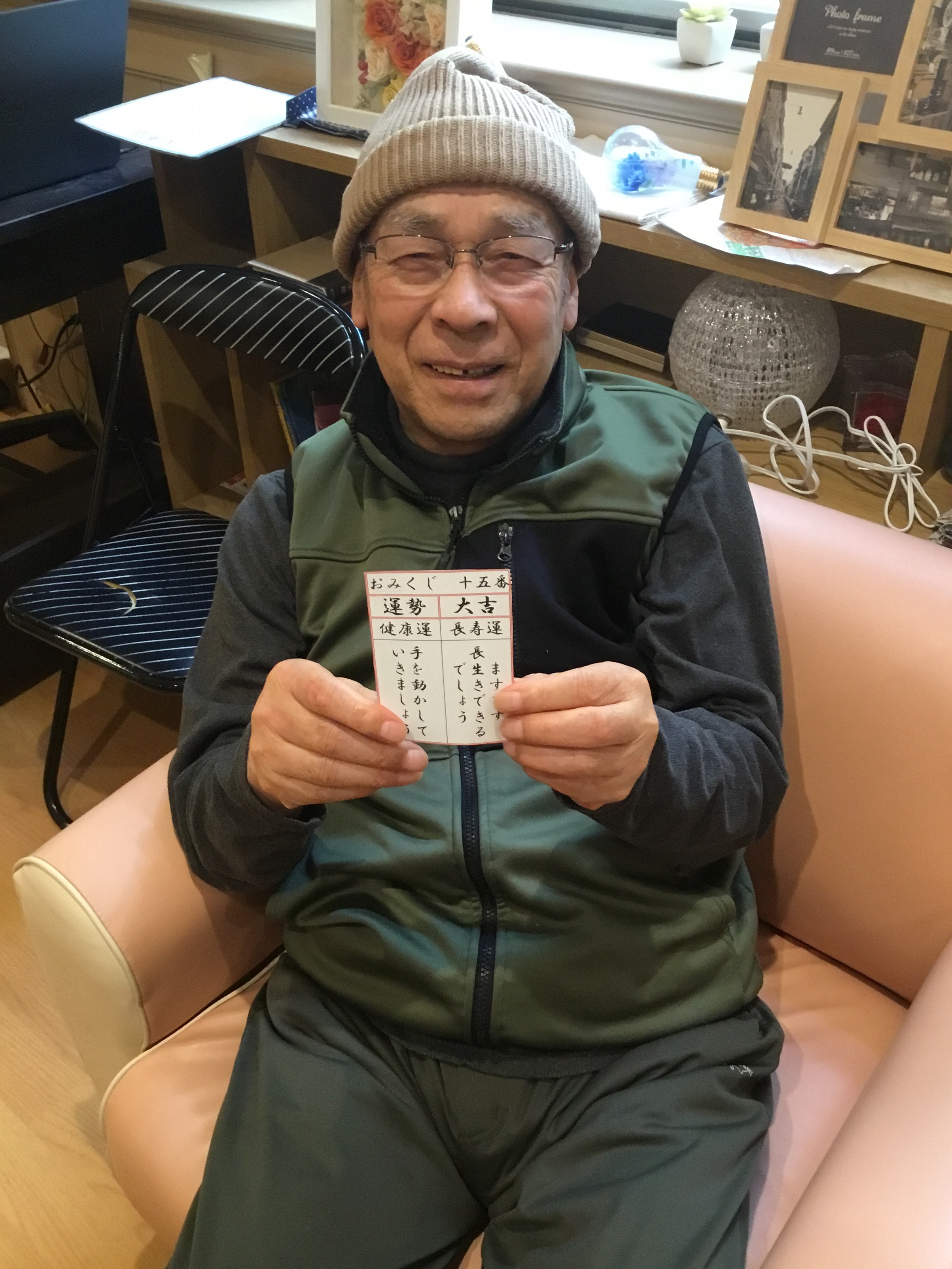 1月1日元日、1階1・2ユニットでは職員手作りおみくじをひいて楽しみました