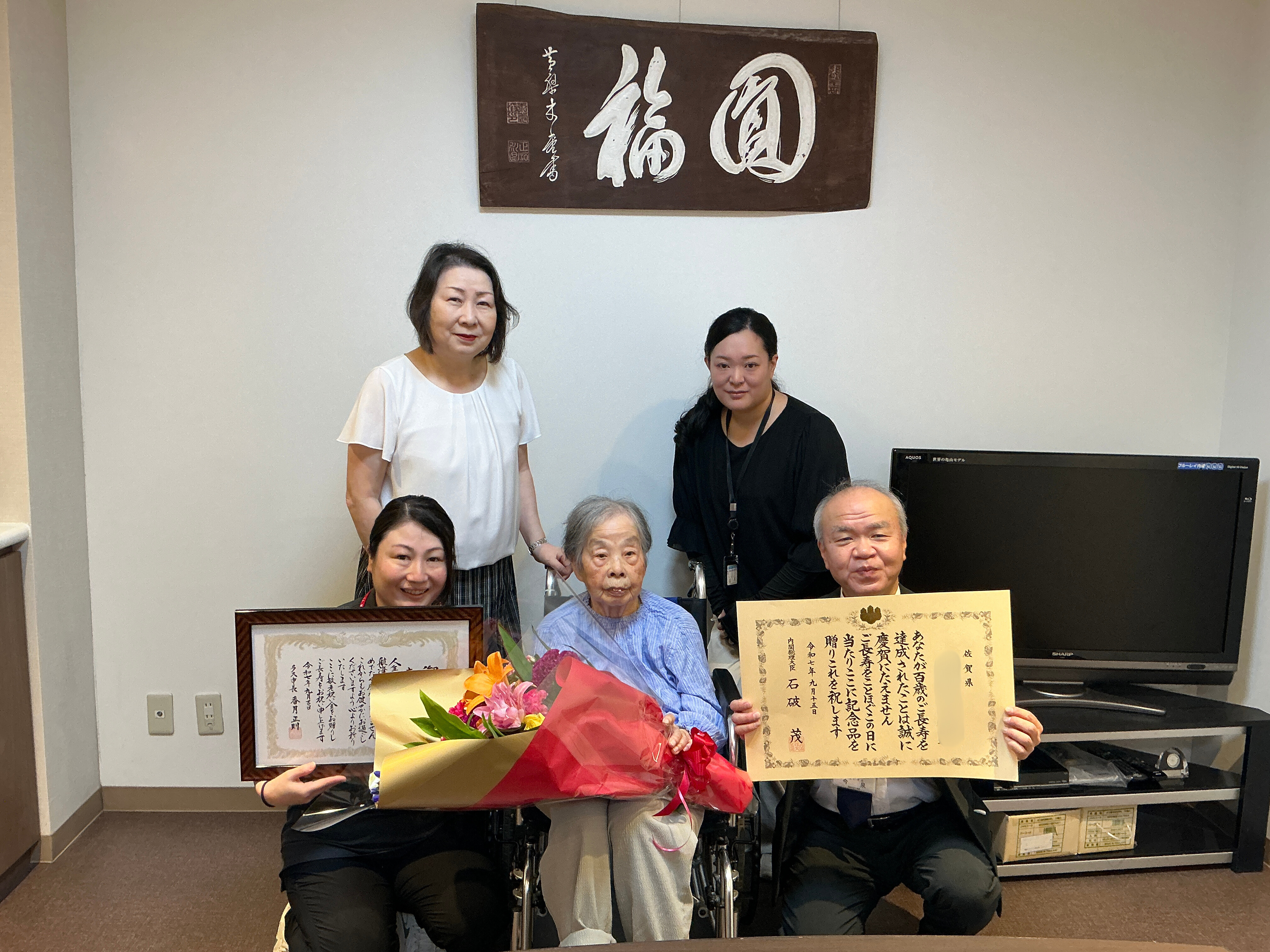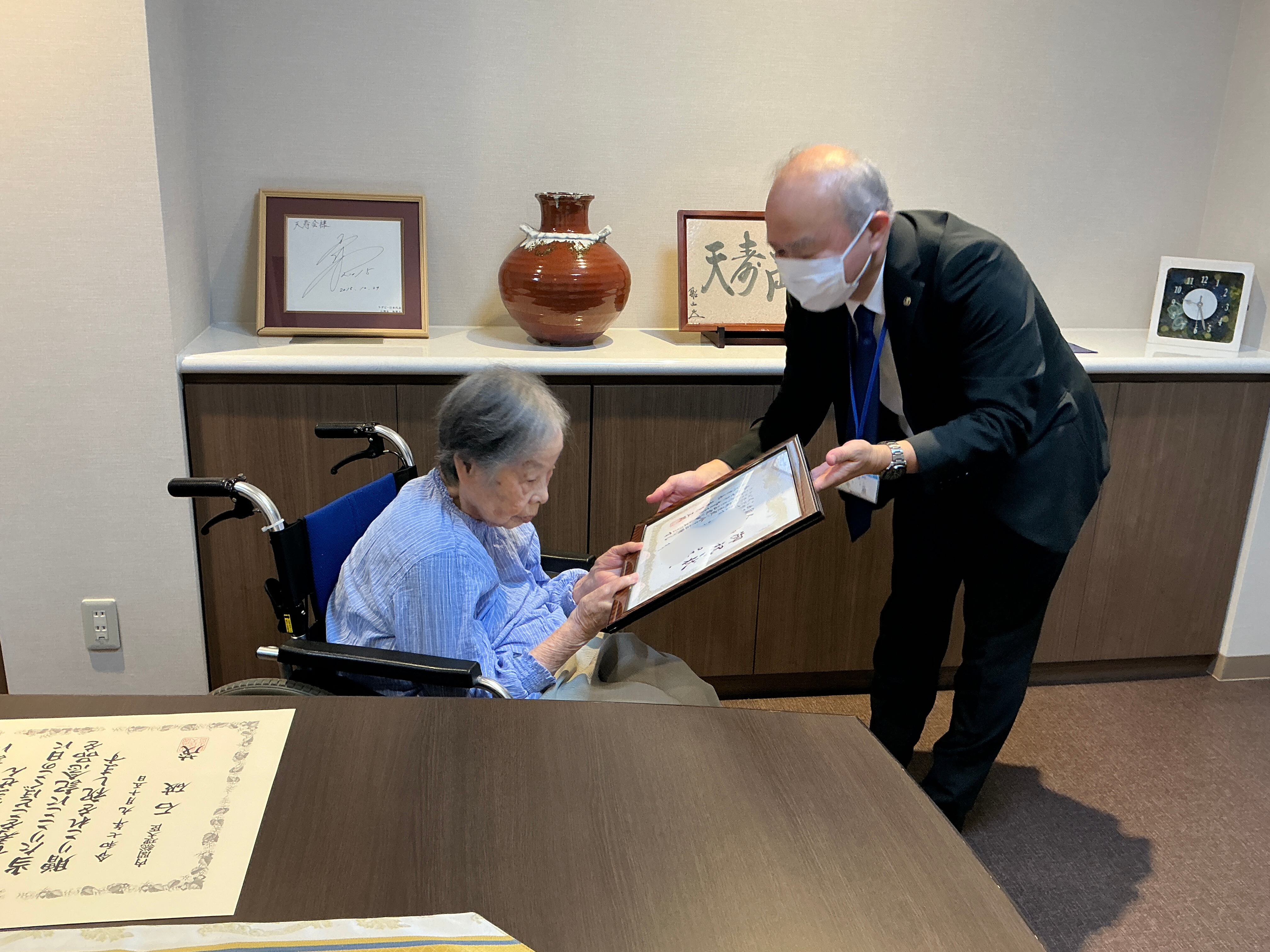 内閣総理大臣からの祝い状や記念品の銀杯、多久市長からの祝い状を届けてくださいました。