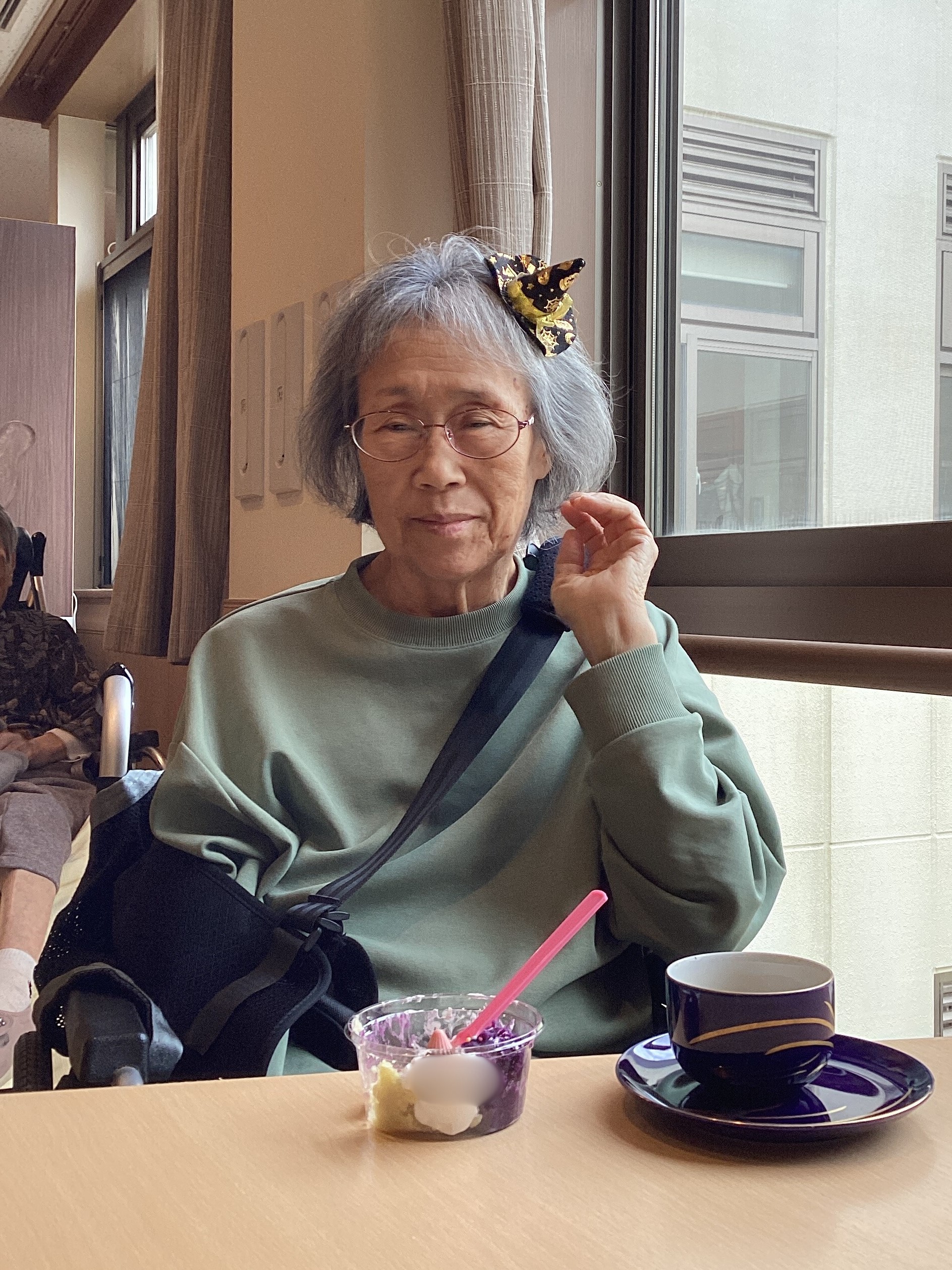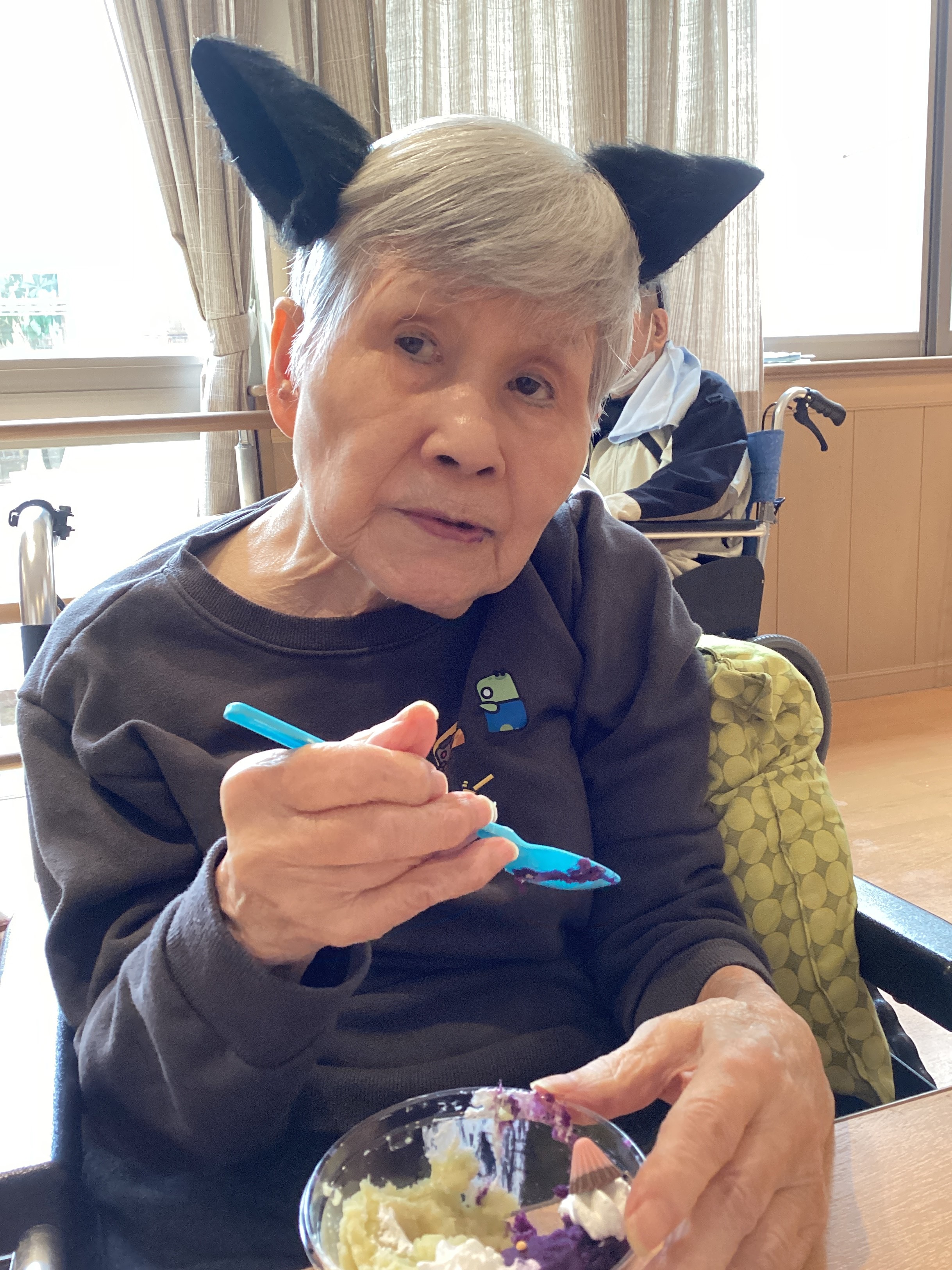 ちょっとした仮装をして、紫芋を使った手作りデザートでティータイム
