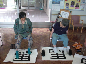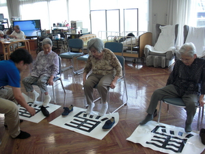 下肢筋力を維持するための訓練として、足先を使って漢字をなぞります。